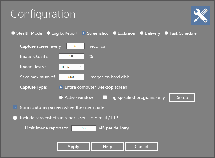 The capture is tells your spy product what to capture when it is time to capture a screen shot. If you would like to capture the entire desktop, select "Entire Desktop Screen". However, if you would only like to see the active window, select "Active Windows". Note: Setting your spy to capture the active window will help conserve disk space, as the screen shot size is tremendously smaller than capturing the entire desktop.