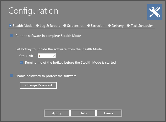 If you run the spy software in the Stealth Mode, you can not locate it in Start menu or Program Files directory as usual. You can only use a hotkey to bring it back. The hotkey is Ctrl+Alt+X as default. Note: hotkey is only available in the Windows user account where the software was installed. It is disabled in other user accounts so that other users will not be able to unhide the software by accidentally pressing the hotkey.